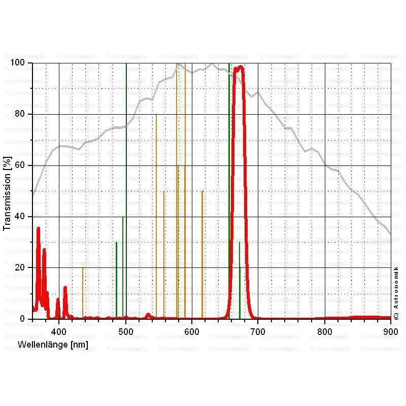 The full width at half maximum (FWHM) of 12nm is optimal suitable for common CCD cameras and allows the use of very fast optics. The range of application extends from 1:2.8 to 1:15. Transmission losses and chromatic distortions, which arise with other filters, only occur with Astronomik filters when extremely bright aperture ratios of 1:2 and more come into play. It should be noted, that the filter has a transmission of up to 99%.