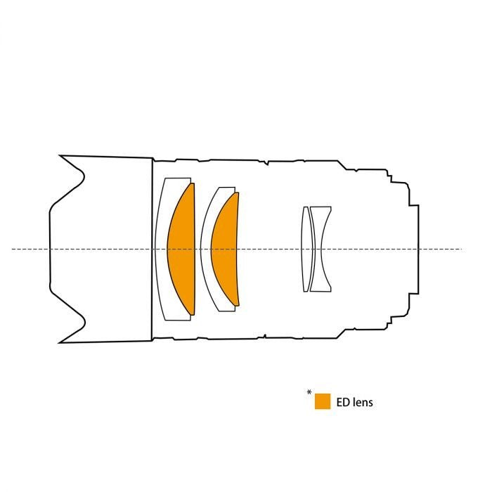 Questo obiettivo è progettato con un triplo di sei obiettivi, tra cui vengono aggiunti due pezzi di vetro ED a bassissima dispersione, che lo rendono migliore degli obiettivi normali nel ridurre l'aberrazione cromatica e avere un'immagine più chiara.