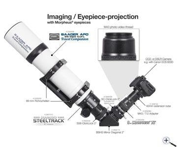 Il design pratico è l'obiettivo principale: metallo minimo per tenere a bada il peso, ottimizzazione per l'osservazione binoculare, filettatura foto-video e i nuovissimi bordi di sicurezza da 1,25" e 2" per evitare lo slittamento (senza sottosquadro). Di notte, apprezzerete il fondino per l'oculare a estrazione rapida e l'incisione foto-luminescente. Imaging / Proiezione dell'oculare: mostra l'oculare Morpheus® sul focheggiatore Diamond-Steeltrack da 2" con adattatori opzionali, ad esempio per il montaggio di una fotocamera DSLR sulla filettatura dell'adattatore foto-video M43.