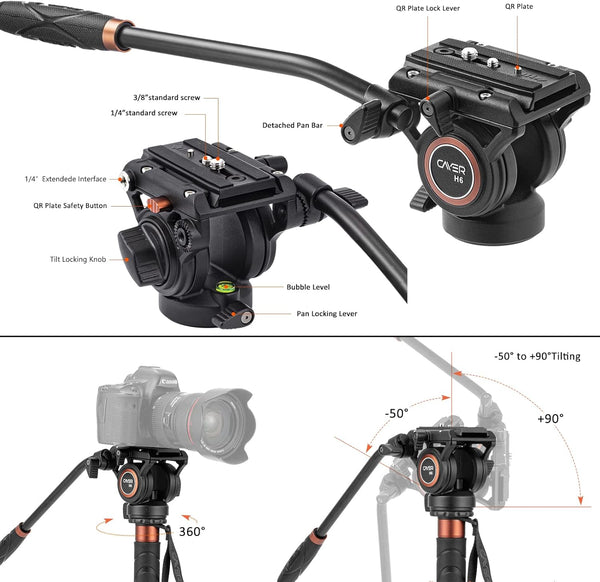 La testata supporta fino a 13,2 libbre e offre una panoramica a 360 ° e un'inclinazione di +90 ° / -50 °; Può essere montato su adattatori a sfera, treppiedi e altri supporti per fotocamere tramite il ricevitore con presa filettata da 3/8 -16 sulla base piatta da 60 mm bloccata in 2 posizioni, consente la rotazione di 360 °, l'inclinazione di 45 ° in tutte le direzioni e una tacca di 90 ° facilita il passaggio dalla modalità orizzontale a quella verticale; assicurato da un blocco.