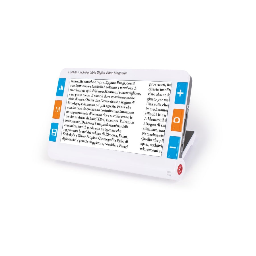 Specifiche Tecniche Schermo LCD 7”HD (1024x600) Ingrandimento da 2X a 32X Doppia fotocamera per visione da vicino/lontano Sensore Sony 8MPx 26 modalità di contrasto immagine Supporto ripiegabile Interfaccia AV e HDMI per collegamento a TV e Monitor Batteria al Litio ricaricabile 5200mAh (durata +4 ore) Slot per scheda SD (non inclusa) Funzione di messa a fuoco automatica Dimensioni: 19.5cm x 12.5cm x 2.5cm Peso: 395 g Accessori: caricabatterie con cavo USB-C, batteria al litio ricaricabile, custodia morbida, cavo AV e HDMI, panno per pulizia schermo.