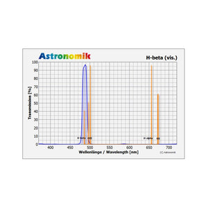 Il filtro blocca le linee di emissione delle lampade a bassa ed alta pressione (mercurio (Hg) e sodio (Na)) e le linee della luminescenza notturna (airglow). La linea H-beta passa il filtro con elevata trasmissività.