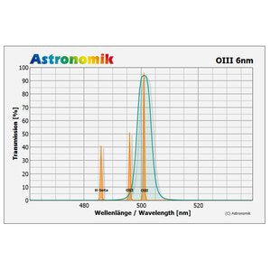 Il filtro CCD OIII esalta il contrasto tra le nebulose di idrogeno e il cielo sullo sfondo. Grazie alla combinazione di una banda stretta di 6nm e ad una elevata trasmissione del 96%, il filtro garantisce un notevole aumento del contrasto, in quanto tutta la luce indesiderata proveniente da lunghezze d'onda diverse da xx , viene bloccata dall'UV fino all'IR. Cio' fornisce uno sfondo estremamente scuro.