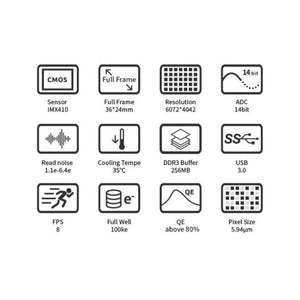 La ZWO ASI 2400MC Pro è una camera astronomica a colori full-frame pensata per astrofotografi avanzati. Integra il sensore Sony IMX410 full-frame da 24 MP con pixel da 5,94 µm, offrendo un eccellente compromesso tra risoluzione e sensibilità. Con un rumore di lettura estremamente basso (1,1 e-), un QE superiore all’80% e ADC a 14-bit, permette di catturare immagini dettagliate e naturali del cielo profondo. Grazie al raffreddamento TEC a doppio stadio fino a –35 °C rispetto all’ambiente e alla memoria buffer DDR3 da 512 MB, garantisce stabilità nelle lunghe sessioni di esposizione. È pienamente compatibile con ASIAIR, Windows, macOS e Linux, ideale per telescopi professionali e setup avanzati.