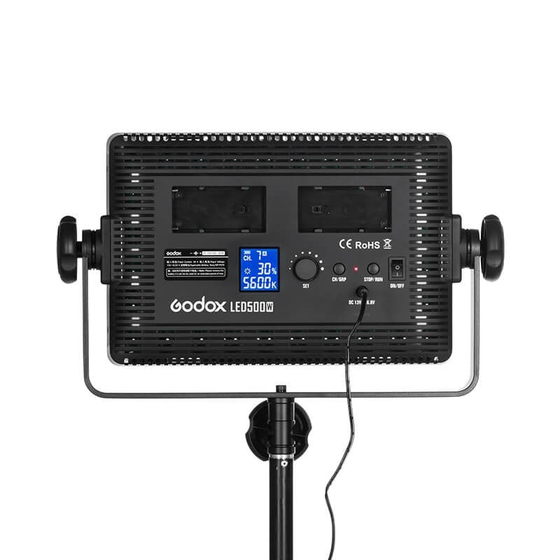 Il pannello di controllo sul retro del dispositivo fornisce tutte le informazioni rilevanti, come la luminosità, il canale insieme al gruppo, la temperatura della lampada. Inoltre Godox LED500W è stato dotato di una pratica manopola per la regolazione della luminosità dal 10% al 100%. Grazie al ricevitore incorporato il pannello può essere controllato da remoto tramite il telecomando RC-A5 (disponibile separatamente). Inoltre, questi dispositivi possono essere anche raggruppati e suddivisi sui diversi canali in modo altrettanto facile. Si possono impostare i parametri diversi per ogni dispositivo, per un gruppo di dispositivi oppure per tutti i dispositivi (anche lo spegnimento). Questo pannello può essere alimentato tramite un adattatore di alimentazione da rete (incluso) o opzionalmente dalle batterie ricaricabili. Il dispositivo emette la luce di altissima qualità, senza effetto di sfarfallio. Il pannello di controllo, dotato di uno schermo di facile lettura, è stato posizionato sul retro del dispositivo. Contenuto della confezione: pannello a LED Godox LED500W scatola originale del prodotto.