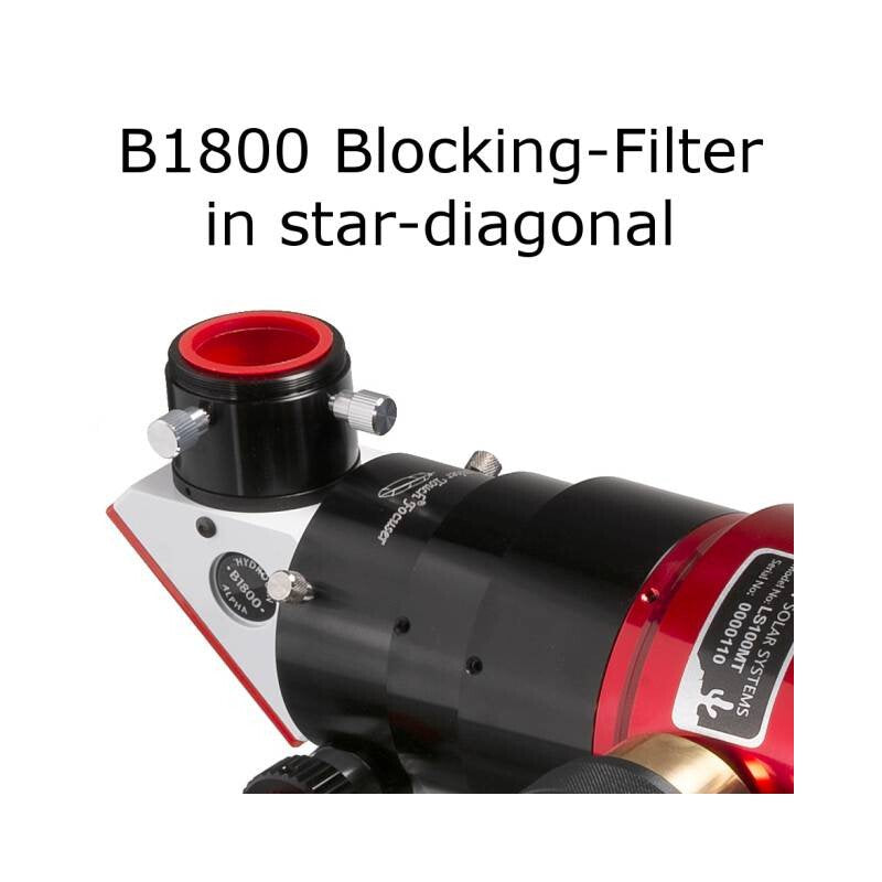 In abbinamento alle ottiche di alta qualità, il telescopio viene fornito con un focheggiatore Feather Touch di Starlight Instruments. Non c'è niente di meglio! Il focheggiatore consente di collegare accessori con attacco da 2", ad esempio uno specchio zenitale o un adattatore per fotocamera. Per l'osservazione solare è assolutamente necessario il filtro di blocco, integrato in modo permanente nell'ottica di deflessione fornita in dotazione. Ciò consente l'adattamento di oculari con attacco da 1,25" o il collegamento fisso a vite di una fotocamera con filettatura T2.
