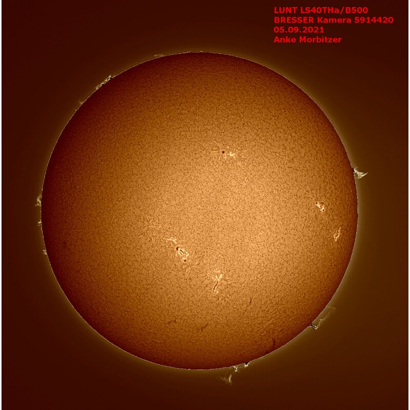 La lunghezza d'onda H-alfa è il modo più spettacolare di osservare il Sole, rivelando protuberanze sul bordo del Sole, filamenti e bagliori sulla superficie insieme a molto altro ancora. Il filtro etalon integrato con regolazione dell'inclinazione meccanica fornisce una larghezza di banda di <0,7 angstrom.