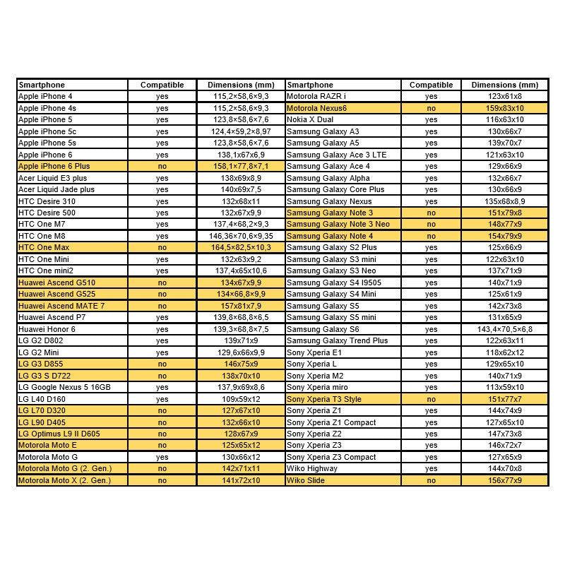 Non importa che tipo di smartphone abbiate: quasi tutti i modelli possono essere fissati e facili da adattare. Perfino i grandi smartphone, come il Samsung Galaxy S4, S5 o S6 trovano perfetta collocazione in questo adattatore.