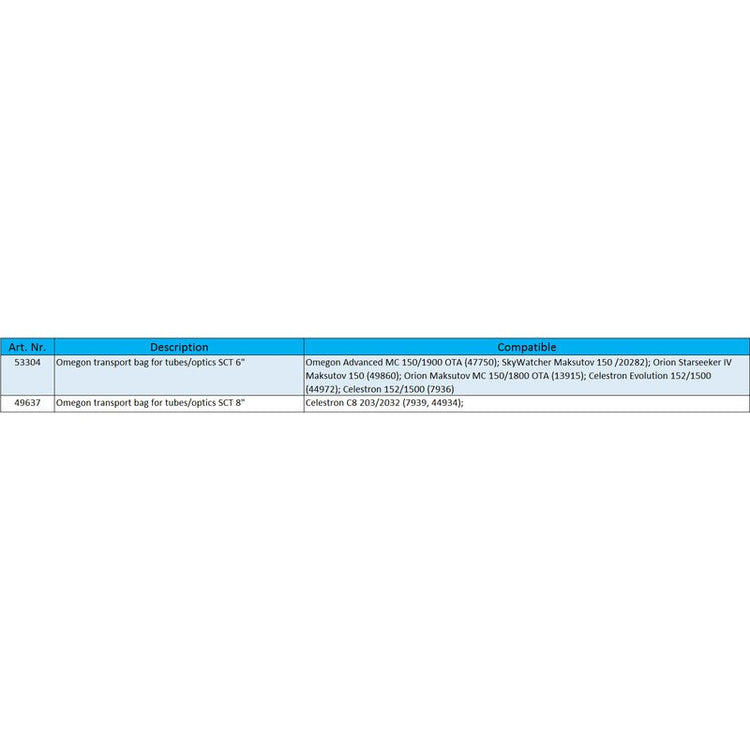 Questa borsa è perfetta per tutte le ottiche da 8 pollici di tipo Schmidt-Cassegrain o Maksutov. Con un diametro di 320 mm e una lunghezza di 620 mm può contenere tubi ottici (OTA), come: