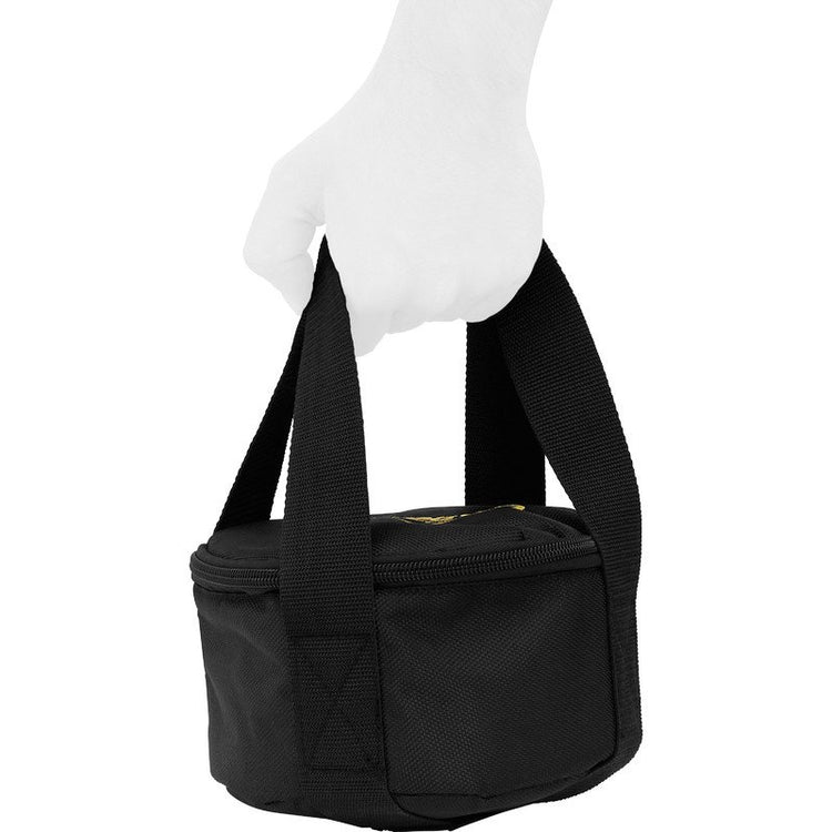 Il materiale in nylon è eccezionalmente robusto, proprio come ci si dovrebbe aspettare da una borsa porta-contrappesi. Durante il trasporto, due cinghie rinforzano la base, mentre l'intera borsa è completamente rivestita da una imbottitura. Porta senza problemi fino a 12 kg di peso.