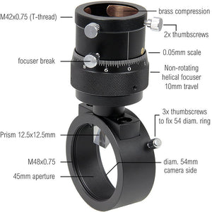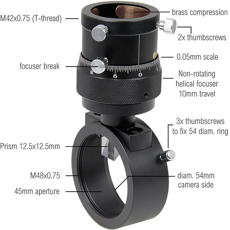 Un piccolo prisma devia lateralmente la luce nell'unità di controllo del vostro guider in un focheggiatore elicoidale da 1,25 pollici. Inserite la vostra auto-guida (una camera per inseguimento automatica) o l'oculare con reticolo. Grazie alla generosa corsa di 10 mm troverete la messa a fuoco ottimale per la vostra stella guida. Risultato impressionante: questo speciale focheggiatore elicoidale può essere regolato tramite una scala super precisa fino a 0,05 mm. Per ritrovare sempre velocemente la vostra messa a fuoco.