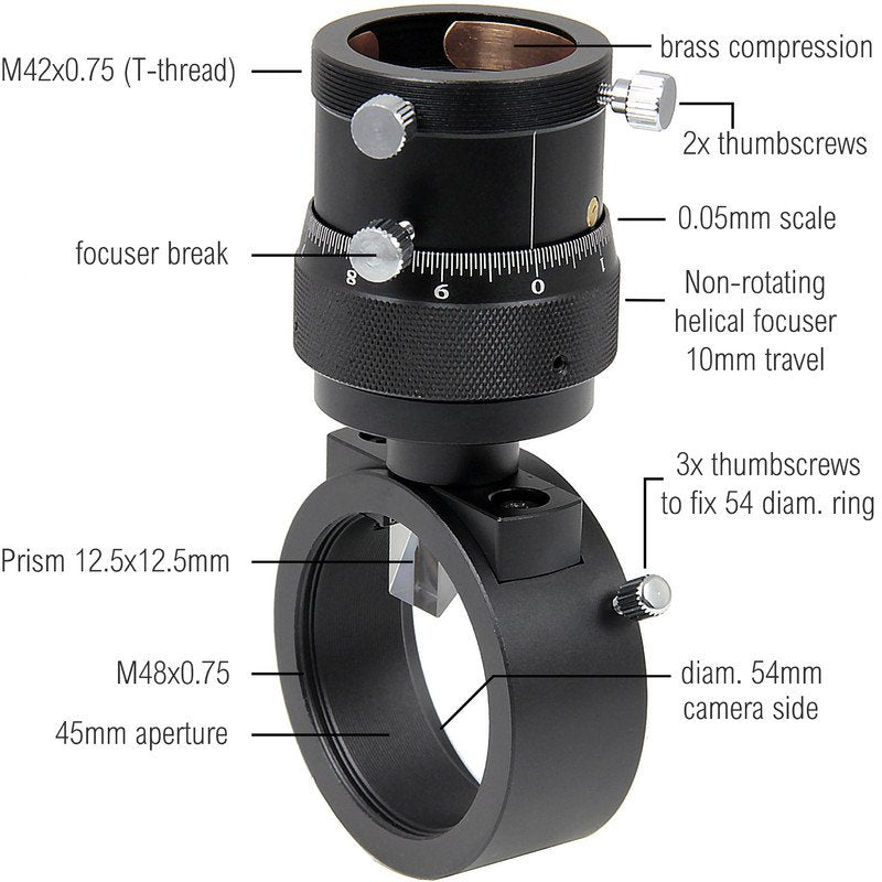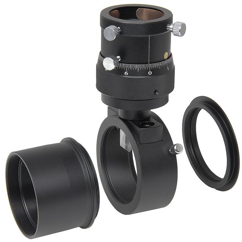 Semplice da adattare: la guida fuori asse Omegon è dotata sul lato telescopio di un raccordo M48 e di un manicotto aggiuntivo per focheggiatori da 2 pollici. Il set accessori comprende tre viti e un adattatore M48 piatto per l'innesto della vostra camera. Il vantaggio: potrete ruotare la vostra camera in qualsiasi momento e individuare il dettaglio perfetto del corpo celeste che state riprendendo.