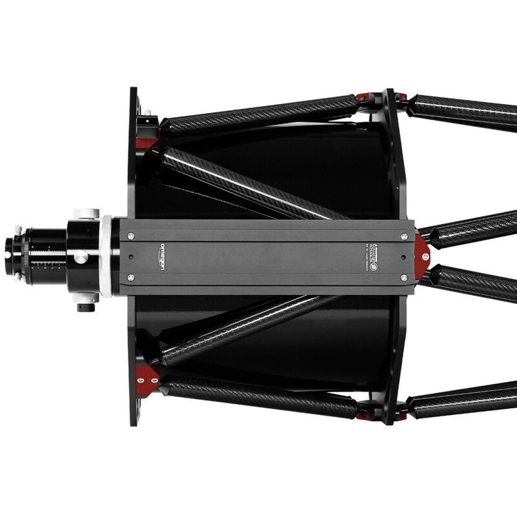 La maggior parte dei telescopi professionali sono dotati di una struttura del tubo a traliccio. I vantaggi che ne derivano sono validi anche per questo strumento. I tubi in carbonio sono rigidi, leggeri e dalla temperatura particolarmente stabile, un altro motivo per cui la messa a fuoco non è soggetta a movimenti. Nelle strutture aperte a traliccio il ricambio d'aria è migliore, ed evita quindi l'insorgere di un microclima all'interno del sistema.