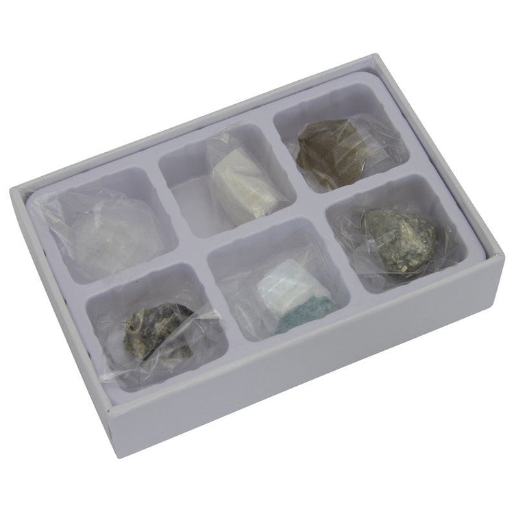 Con questo set di sei diversi minerali si potrebbe dire che la Natura abbia composto poesie sotto forma di pietre. Ogni minerale mostra il proprio colore e la propria struttura, ma solo immergendovi in profondità con il vostro microscopio potrete scoprire incredibili dettagli.
