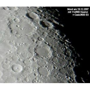 Descrizione del produttore: Questo telescopio è disponibile anche in un set per principianti con accessori. Il classico telescopio newtoniano a specchi, dal nome del suo inventore Isaac Newton, con queste misure e con questa meccanica, è sul mercato da trent'anni con ottime prestazioni. Con 114 mm di apertura questo telescopio è decisamente più luminoso di un cannocchiale della stessa fascia di prezzo, ed è per questo preferito dai neofiti. L'ottica 114/900: Lo specchio da 114 mm rende possibile sia affascinanti osservazioni planetarie che interessanti escursioni nello spazio profondo. Scoprite gli anelli di Saturno, le lune di Giove o il pianeta a noi più vicino, Marte: con condizioni favorevoli (durante le opposizioni), potrete rilevare le prime strutture della superficie. Il tubo ottico è dotato di focheggiatore da 1,25'', che supporta tutti gli oculari standard. Il focheggiatore ha una ghiera con la quale definire la messa a fuoco dell'oggetto prescelto. Il cercatore permette di trovare gli oggetti nel cielo e di inquadrarli quindi nel telescopio principale. Il cercatore presenta un reticolo a croce per centrare meglio l'oggetto. E' già tutto compreso nella spedizione: oculare 25 mm per ingrandimento 36x oculare 10 mm per ingrandimento 90x cercatore 6x30 per trovare facilmente i corpi celesti. lente di Barlow 2x per raddoppiare gli ingrandimenti degli oculari I vantaggi in sintesi: con un'apertura da 114 mm è 2,5 volte più luminoso di un telescopio da 70mm focheggiatore da 1,25'' ottica collimabile La montatura EQ-1: Questa montatura equatoriale offre la possibilità di allineare con precisione l'ottica con la Stella Polare. Per ogni punto d'osservazione è possibile impostare la corretta altezza della Stella Polare o amplitudine. Con movimenti micrometrici in Ascensione Retta e Declinazione si possono puntare e seguire con precisione gli oggetti, mentre un contrappeso assicura un corretto equilibrio del tubo ottico. La montatura EQ-1 viene spedita in due varianti, con cavalletto o con cavalletto da tavolo, per cui valutate con attenzione i dati tecnici. Il cavalletto è regolabile e può raggiungere un'altezza compresa tra i 70 ed i 120 cm. Un portaoggetti offre spazio per oculari ed accessori vari. Il cavalletto da tavolo è estremamente compatto e leggero. E' pertanto particolarmente adatto per viaggi o escursioni. La più piccola delle montature EQ è estremamente leggera e compatta, e sta in quasi tutte le borse. Qualsiasi novizio la può montare con facilità e può anche essere tranquillamente usata dai bambini. Può essre equipaggiata di un motore di inseguimento in Ascensione Retta (opzionale). La spedizione comprende: montatura equatoriale EQ-1 cavalletto contrappeso Non è importante solo il tipo di telescopio che si compra, ma anche dove lo si compra. I nostri servizi extra: Siamo un rivenditore leader nel settore dei telescopi e conosciamo bene questi strumenti. Il nostro servizio è quindi a vostra disposizione anche dopo l'acquisto, nel caso ci fossero problemi nel montaggio o nell'utilizzo. Per ogni telescopio forniamo il manuale introduttivo di 80 pagine Telescope Basics (in inglese). Commento del nostro esperto: Il telescopio 114/900mm EQ-1 dispone, per la sua fascia di prezzo, di un'ottica di qualità elevata. Lo specchio è sferico ma in questo caso - con un rapporto d'apertura di 1:7,9 - non è affatto un problema. La montatura, per uno strumento di questa taglia, può essere utilizzata solo per scopi visuali. L'astrofotografia non è agevole, anche se rivenditori meno seri a volte non lo dicono. Fate attenzione agli ingrandimenti: molti attribuiscono a telescopi di questo tipo la possibilità di ingrandimenti 300x o anche 600x . Teoricamente tutti i telescopi possono raggiungere tali ingrandimenti. Bisogna però stare attenti! L'ingrandimento utile massimo di questo tipo di telescopi è di circa 230x, se si vogliono osservare gli oggetti in modo ancora distinto. Questo telescopio offre senz'altro il miglior rapporto qualità/prezzo tra tutti gli strumenti della sua categoria. Se potete spendere qualcosa di più, vi consigliamo l'Omegon 130/920 EQ-2 con un'ottica più grande ed una montatura ancora più stabile. (Dominik Schwarz) La montatura equatoriale EQ-1 con il suo contrappeso. Solo con questo tipo di montatura è possibile seguire con precisione gli oggetti celesti. Con i pratici cavi flessibili potrete sempre mantenere l'oggetto nel campo visivo. Col cercatore 6x30 è facile trovare in cielo gli oggetti che poi potrete osservare col telescopio. Lente di Barlow – per aumentare la lunghezza focale. Abbinandola ad un oculare potrete raddoppiarne l'ingrandimento. Col telescopio potete osservare migliaia di crateri sulla Luna ed anche interessanti canali. Immagine della Luna di Bernd Gährken presa con un telescopio Omegon 114/900mm. Accessori raccomandati: Prima di comprare questo prodotto, dai un'occhiata agli accessori raccomandati. dettagli accessori