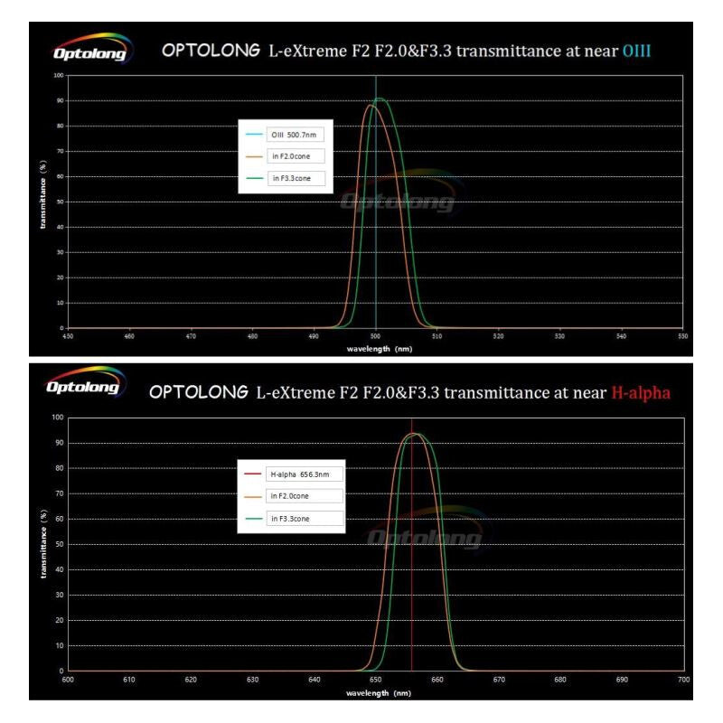 A differenza del filtro L-eNhance, che è un filtro a tre bande (trasmette Hb, Ha e OIII), il filtro L-eXtreme è un filtro a doppia banda che permette il passaggio delle linee di emissione H-Alfa e OIII.