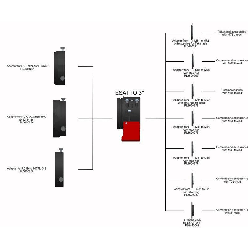 Non devi preoccuparti di come collegare ESATTO al tuo telescopio: puoi scegliere tra molti adattatori già disponibili! Puoi facilmente collegare ESATTO a telescopi come Schmidt-Cassegrain, Schmidt-Cassegrain Aplanatici, rifrattori, Cassegrain, Newton e molti altri! ESATTO è veramente il focheggiatore robotico universale e se non riesci a trovare un adattatore per il tuo telescopio, contattaci!