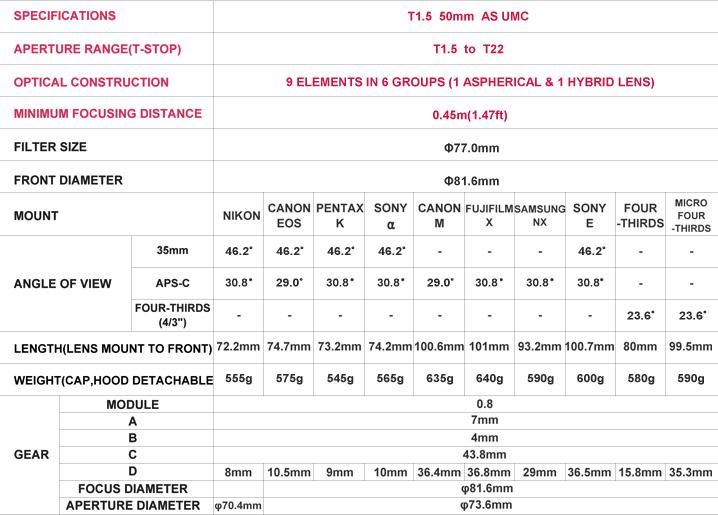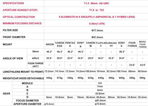 Ci sono 8 lamelle del diaframma, le quali sono state progettate per essere quasi come un cerchio completo quando il diaframma è totalmente chiuso, il tutto per garantire una perfetta profondità di campo. Il corpo del Samyang 50mm T/1,5 VDSLR AS UMC è solido e compatto, formato da alluminio ad alta resistenza. Immagini fedeli possono essere catturate anche in condizioni non favorevoli ed il paraluce a petalo è necessario per rimuovere luci parassite.