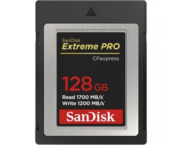 La Sandisk Extreme Pro CFExpress 128 GB è una scheda di memoria CFExpress (compatibile anche con fotocamere XQD) da 128 GB, con velocità di scrittura 1200MB/s e velocità di lettura 1700 MB/s; è adatta anche alla registrazione di video 4K RAW Ultra High Definition