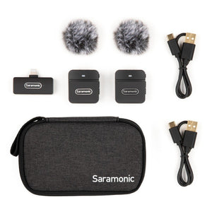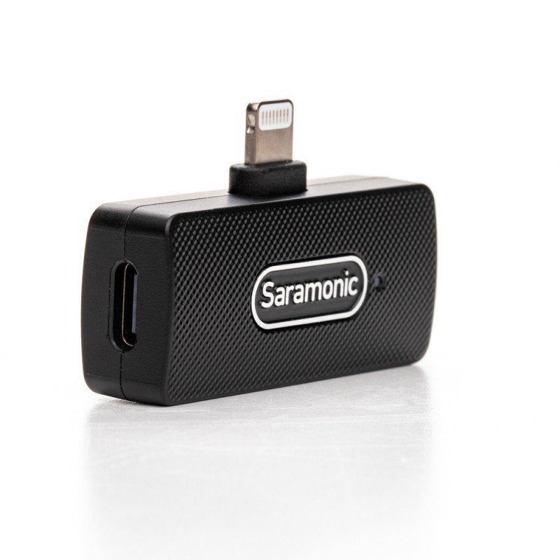 Saramonic Blink100 B4 wireless audio transmission kit (RXDI + TX + TX) The wireless audio transmission kit Saramonic Blink100 B4 (RXDI + TX + TX) will allow you to conveniently work with iPhones and iPads equipped with a Lightning port. This system will certainly be appreciated by web creators, youtubers and streamers using equipment from Apple. The kit includes 2 Blink100 TX transmitters and 1 Blink100 RXDi receiver which plugs directly into the chosen device. An iPhone or iPad can be charged while recording via an additional USB-C port. The audio transmission range is 50 metres. A full charge of the transmitters built-in batteries will provide up to 10 hours of continuous operation. The devices feature an auto-pairing system and noise cancellation mode. The necessary cables and deadcat wind shields are also included. Main product features wireless audio transmission kit with 1 receiver and 2 transmitters compatible with Apple devices equipped with a Lightning port ideal for use with iPhones and iPads ultralight and compact broadcasts with built-in omnidirectional microphones recording 360º sound a great choice for vloggers, youtubers, web creators and journalists intelligent ambient noise reduction fast automatic pairing of transmitters with receiver transmitters equipped with clips for attaching to clothing colour LED to indicate operating status maximum range is 50 metres up to 10 hours of operation on a single charge recharging the transmitters via the popular USB-C port the USB-C port on the receiver allows you to charge your smartphone or tablet when using the Lightning port the USB-C port supports super-fast charging (3A) wind shield included Tens of uses The microports included in the kit (2 transmitters and a receiver) are perfect for the nature of vloggers, journalists, video makers and filmmakers working at weddings and conferences. The Saramonic Blink100 B4 wireless audio transmission kit (RXDI + TX + TX) provides a maximum signal range of 50 metres. This allows the people being recorded to move freely with the transmitters, and high quality audio will be captured by the receiver without any interference. Ideal for Apple equipment users The Saramonic Blink100 B4 (RXDI + TX + TX) wireless audio transmission kit was developed specifically for users of equipment from Apple. The Lightning connector used in the receiver easily connects to your iPhone or iPad, even if the device is in an armoured case! Get to know the entire Blink100 family! The devices you use for audio recording are not equipped with a Lightning socket? No problem. The Saramonic Blink100 family has no shortage of kits offering alternative receiver versions. Variants B1 and B2 will easily connect to cameras, camcorders, audio recorders and other devices equipped with a 3.5mm mini jack. The B5 and B6 sets will be a great choice for those who want to record audio on devices that offer a USB-C port. RX AND RXUC RECEIVERS ARE NOT PART OF THE KIT. BEFORE YOU BUY, MAKE SURE YOU CHOOSE THE PERFECT PRODUCT VARIETY. Great sound quality Working with the Saramonic Blink100 B3 (RXDI + TX) wireless audio kit will ensure that speeches in front of the camera, interviews, streams, lectures and conversations are recorded loud and clear. The transmitters built-in omni-directional microphones will work well wherever you want natural sound. If you are not keen on tangled tie microphone cables, this solution is sure to meet your expectations! Up to 10 hours of uninterrupted operation Fully charged Blink100 TX transmitters can provide up to 10 hours of uninterrupted operation. This means you can record several episodes of your YouTube show, shoot an all-night wedding, and complete a lengthy interview or report in a single day without rushing. Environmental noise reduction The "+" and "-" buttons, which you will find on the casing of the Blink100 TX transmitters, allow you to adjust the signal gain ("gain"). Pressing them simultaneously also enables the special ambient noise reduction mode to be switched on or off. The microports also come with high-quality deadcat covers. These will reduce unwanted wind noise when recording outdoors. Always-on-your-place The Blink100 TX transmitters are equipped with special clips that allow you to conveniently attach the devices to your shirt, blouse or jacket lapel. Using such a solution ensures that the microports stay in place. Model: Saramonic Blink100 B4 Blink100 RXDi receiver digital transmission: 2.4 GHz bandwidth: 20Hz - 16 KHz reach: up to 50 m output power: 6 dBm port: USB-C plu Lightning dimensions: 46 x 20 x 12 mm weight: 10 g Blink100 TX transmitter digital transmission: 2.4 GHz directional characteristic: omnidirectional bandwidth: 20Hz - 16 KHz signal-to-noise ratio (SNR): > 80 dB built-in microphone sensitivity: -39 dB ± 2 dB range: up to 50 m operating time on one charge: approx. 10 h built battery capacity: 90 mAh charging port: USB-C dimensions: 39 x 35 x 14 mm weight: 16.5 g Kit contents 1 x Blink100 RXDi receiver 2 x Blink100 TX transmitter 2 x USB-A / USB-C cable 2 x deadcat wind shield