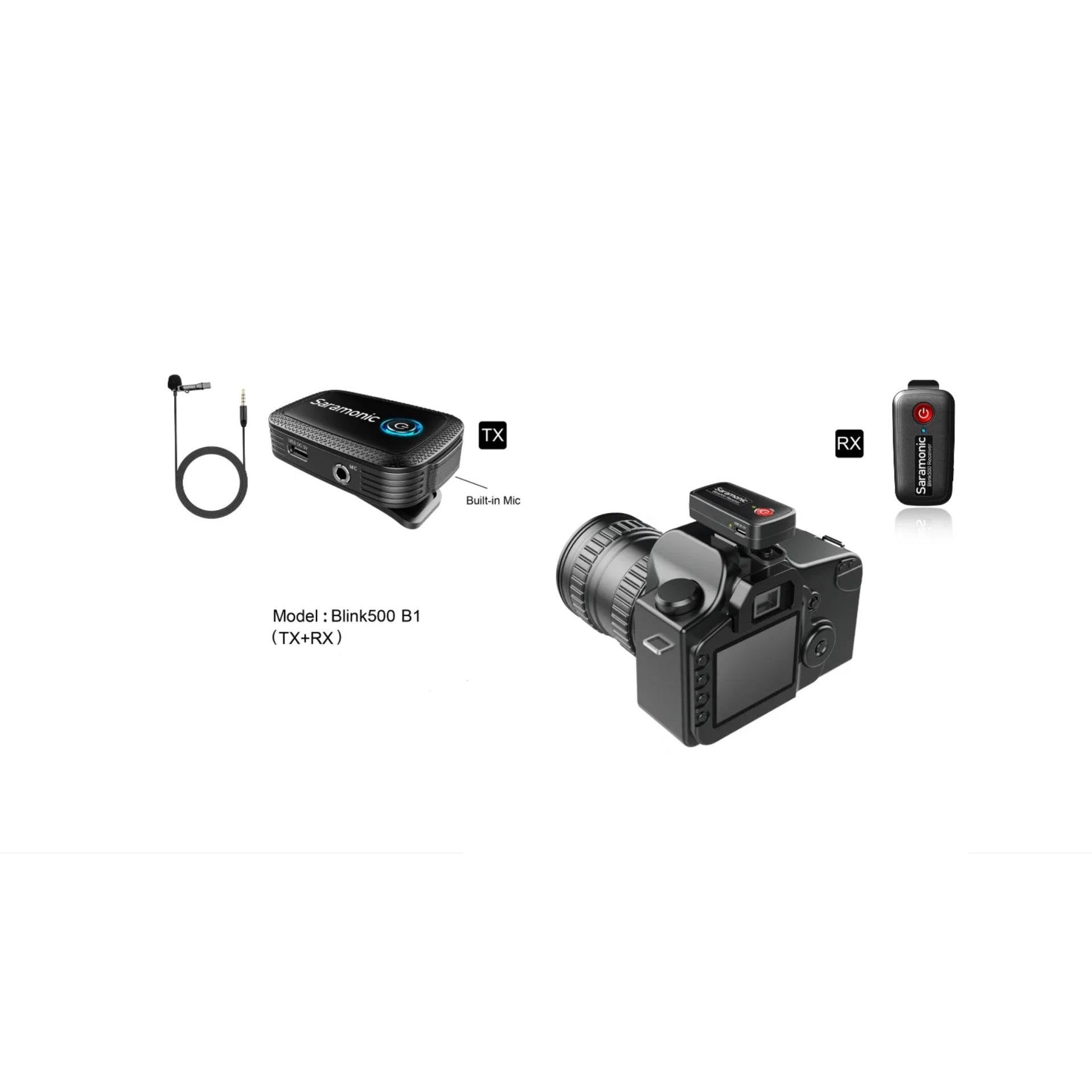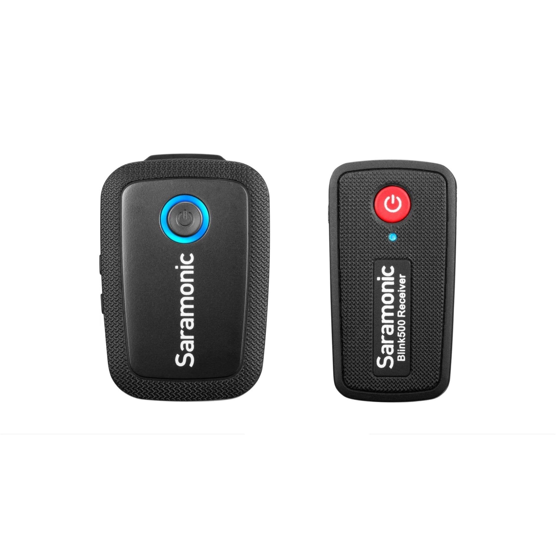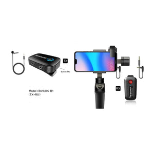 You can put a mic on one person, but if you ever need to put mics on two people, you can simply add a second wireless transmitter (sold separately) and it will work perfectly with the included dual receiver. The Blink 500 B1 is impossibly compact and lightweight, yet it delivers crystal-clear professional sound quality. The versatile transmitter features an excellent sounding built-in microphone that captures voices perfectly. Small enough to clip to a shirt or slide into a pocket and versatile enough to set on a table or podium, or even used handheld. It also operates as a traditional bodypack transmitter with the included SR-M1 professional omnidirectional clip-on lavalier microphone, providing an even more professional and visually discreet miking solution. Some wireless microphone systems are complicated to operate and require detailed knowledge of their menus and settings, but the Blink 500 B1 is so technically advanced that it couldnt be easier to use. You just turn it on, and it works. But behind the scenes the Blink 500 is doing a lot to ensure excellent performance. It operates on the interference-free 2.4GHz spectrum, and automatically hops channels to avoid static noise and audio dropouts. Pairing the transmitter to the receiver is simple, and all of the complicated aspects of using wireless microphones happen seamlessly in the background, letting you concentrate on storytelling and getting a great shot. https://www.youtube.com/watch?v=1Ws8kOTXfyI Perfect levels and power. One of the tricky aspects of capturing sound for video is controlling the audio levels. Some people speak very loudly, while others speak very softly. ThatÕs why Blink 500 transmitters have easy-to-use gain buttons to raise or lower the levels at the touch of a button, and an intelligent LED display shows you where theyre set. The internal Lithium batteries get 5 hours of life from a charge with the included charging cables, and the USB-C ports can be used to power or recharge the units in the field with portable USB battery packs. The 10-milliwatt power of the transmitter gives you an impressive range of 98 feet (30 meters) with obstacles, and 164 feet (50 meters) in open spaces. Loves cameras & mobile devices equally. Both TRS and TRRS output cables are included so the system will work perfectly with DSLR, mirrorless, and other kinds of cameras, as well as smartphones and tablets that have headphone jacks. The output of the receiver provides a strong, noise-free level, so when you plug it in you can adjust the input level of your camera to its lowest setting to avoid hearing the noisy preamp of your camera. An ideal wireless system. Portable, compact wireless microphone systems are completely essential tools for anyone who shoots video, and the fact that the Blink 500 is one of the smallest and most lightweight systems you can ge yet it still delivers professional quality sound makes it ideal for filmmakers, journalists, vloggers, YouTube creators, corporate video producers, or any content creator that needs an incredibly easy-to-use wireless system that wont slow them down. Its small enough to tuck away into any camera bag, backpack or even your pocket, so you can effortlessly bring it with you everywhere you go. The Blink 500 B1 system is perfect for people who only need one wireless mic right now but may need the option to expand and use two in the future. Plus, the Blink 500 series is an evolving system of products that will soon be expanding, giving users even more options and versatility. Transmitter Specifications: Frequency: 2.4GHz Oscillator Type: Gaussian Frequency-Shift Keying (GFSK) RF Frequency Band: 2400 to 2483.5 MHz RF Output Power: 10 mW Signal to Noise Ratio: ≥70dB Voice Delay: ≤6ms Reference Audio Input Level: -30 to -42dBv (Microphone Input, 0 dB Attenuation) Audio Gain Control: 11dB, 18dB, 25dB Plug-In Power: Yes, 1V Distortion: ≤0.1% Digital Resolution: 24-bit / 48kHz Frequency Response: 20Hz to 16kHz Max Operating Range: 98.4’ (30m) with Obstacles, 164’ (50m) in Open Area Max Number of Simultaneous Systems: 18 (up to 36 Microphones) Antenna: Built-in 1/4λ Wire Antenna Buttons: On / Off / Pair, Volume Up, Volume Down Battery: Built-in Li-ion 3.7V / 400mAh Approx. Battery Life: 5 hours Charging Connector: USB Type-C (1.5 hours to be fully charged) Input: 1/8 (3.5mm) Microphone Input Indicators: 4 x Blue LEDs: Indicates Power and Audio Level, 1 x Red LED: Indicates Low Battery Level, 1 x Green LED: Flashing when Charging / Off when Charge Finished Microphone: Built-In Pressure Operated Electret Condenser Microphone Pickup Pattern: Omnidirectional (Built-In Microphone and External Lavalier) Microphone Frequency Range: 50Hz-18KHz (Built-In Microphone and External Lavalier) Microphone Equivalent Noise Level: >58dB (Built-In Microphone and External Lavalier) Maximum SPL: 120dB (Built-In Microphone), 110dB (External Lavalier) Mounting Clip: Built-In Operating Temperature: 0℃ to 50℃ Storage Temperature: -20℃ to +50℃ Dimensions: 2.5 x 1.7 x .65” (63 x 43 x 16.5mm) Weight: 1.2 oz (34g) Receiver Specifications: Frequency: 2.4GHz Oscillator type: Gaussian Frequency-Shift Keying (GFSK) RF Frequency Band: 2400 to 2483.5 MHz Signal to Noise Ratio: ≥70dB Voice Delay: ≤6ms Distortion: ≤0.1% Digital Resolution: 24-bit / 48kHz Frequency Response: 20Hz to 16kHz Max Operating Range: 98.4’ (30m) with Obstacles, 164’ (50m) in Open Area Antenna: Built-In 1/4λ Wire Antenna Buttons: On / Off / Pair Battery: Built-in Li-ion 3.7V / 400mAh Approx. Battery Life: 5 hours Charging Connector: USB Type-C Output: 1/8 3.5mm Jack (Headphone Compatible) Audio Output Level: 5dB Indicator: 1 LED, Blue. Flashing quickly: Paring, Flashin Not Paired with any TX, Solid Blue: Paired with TX Operating Temperature: 0℃ to 50℃ Storage Temperature: -20℃ to +50℃ Dimensions: 2.4 x 1.3 x .61” (62 x 33 x 15mm) Weight: 1.09 oz (31g) In the set: 1 x Blink 500 TX Transmitter with Built-In Microphon