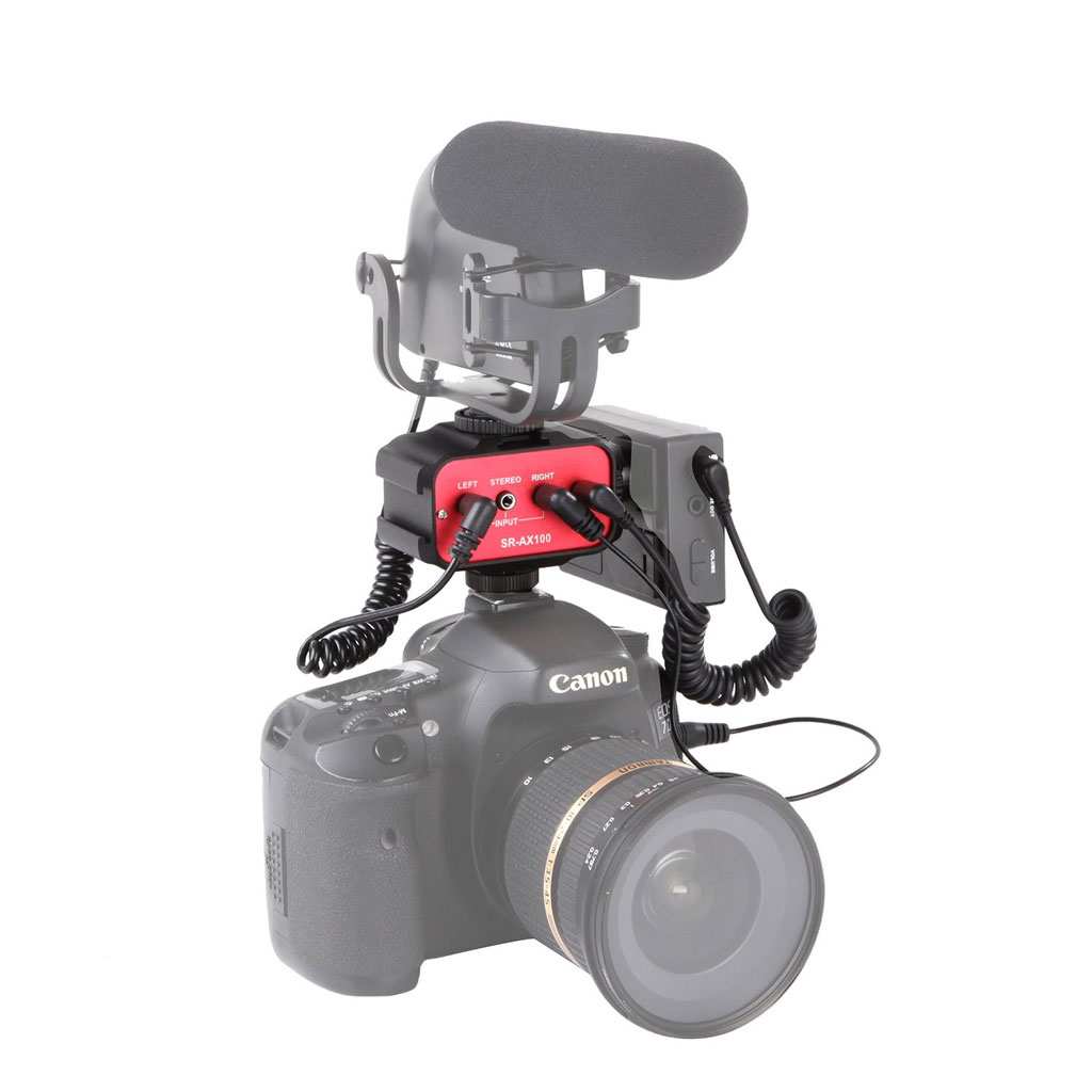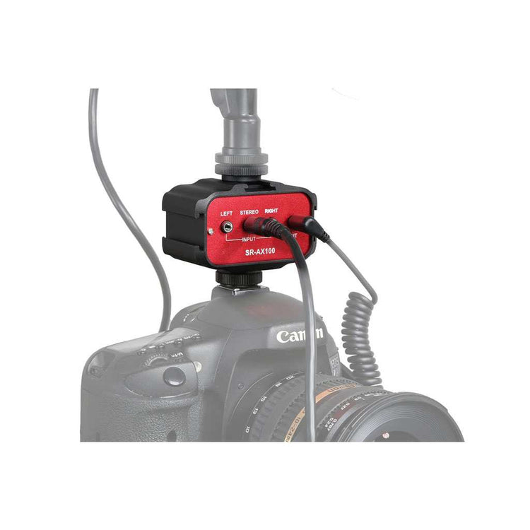 Il SARAMONIC SR-AX100 è un adattatore audio on-camera due canali compatibile con ingressi ed uscite mini-Jack (1 input stereo o 2 input mono su una uscita stereo) standard da 1/8 - 3,5mm