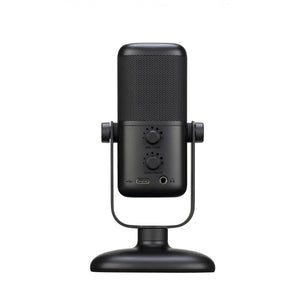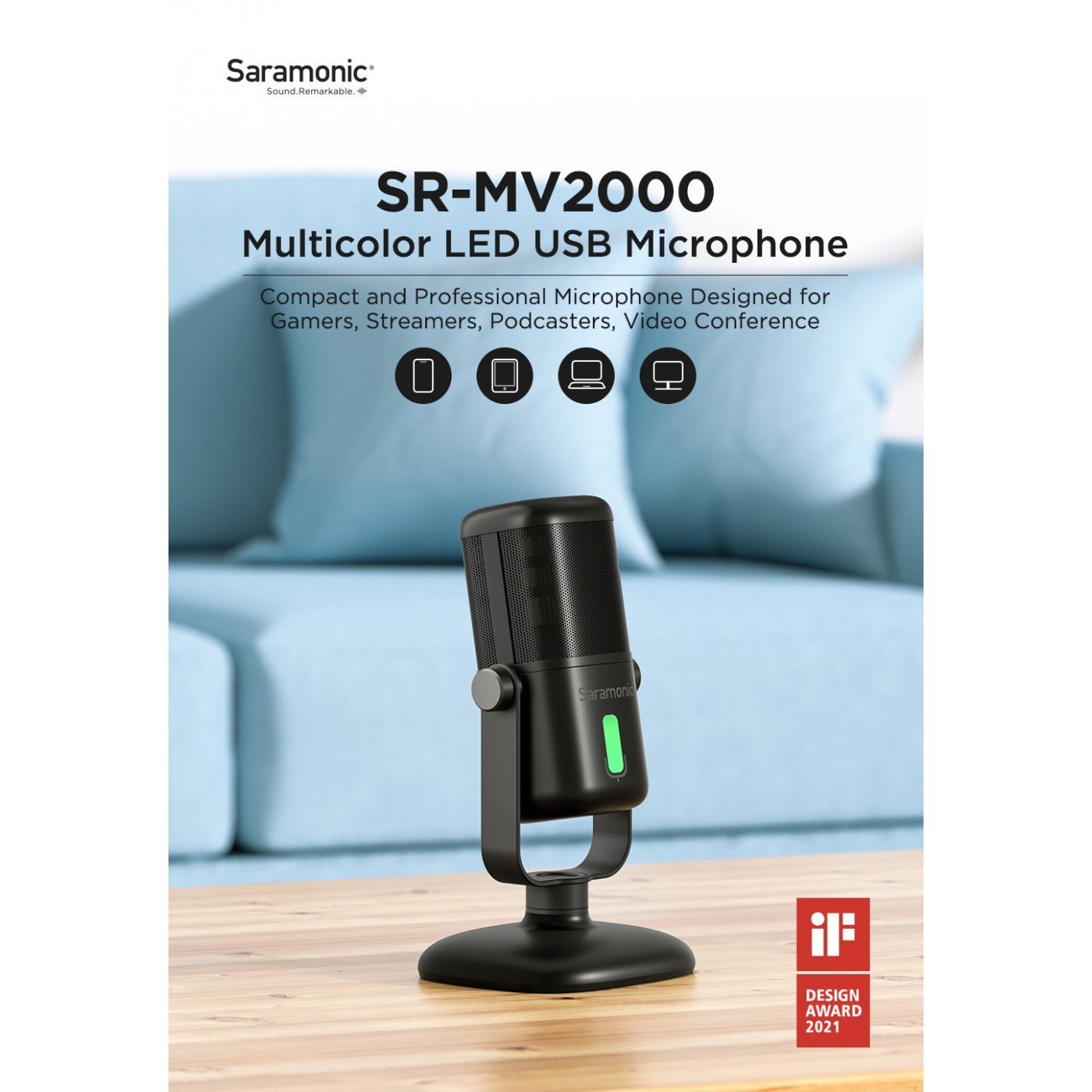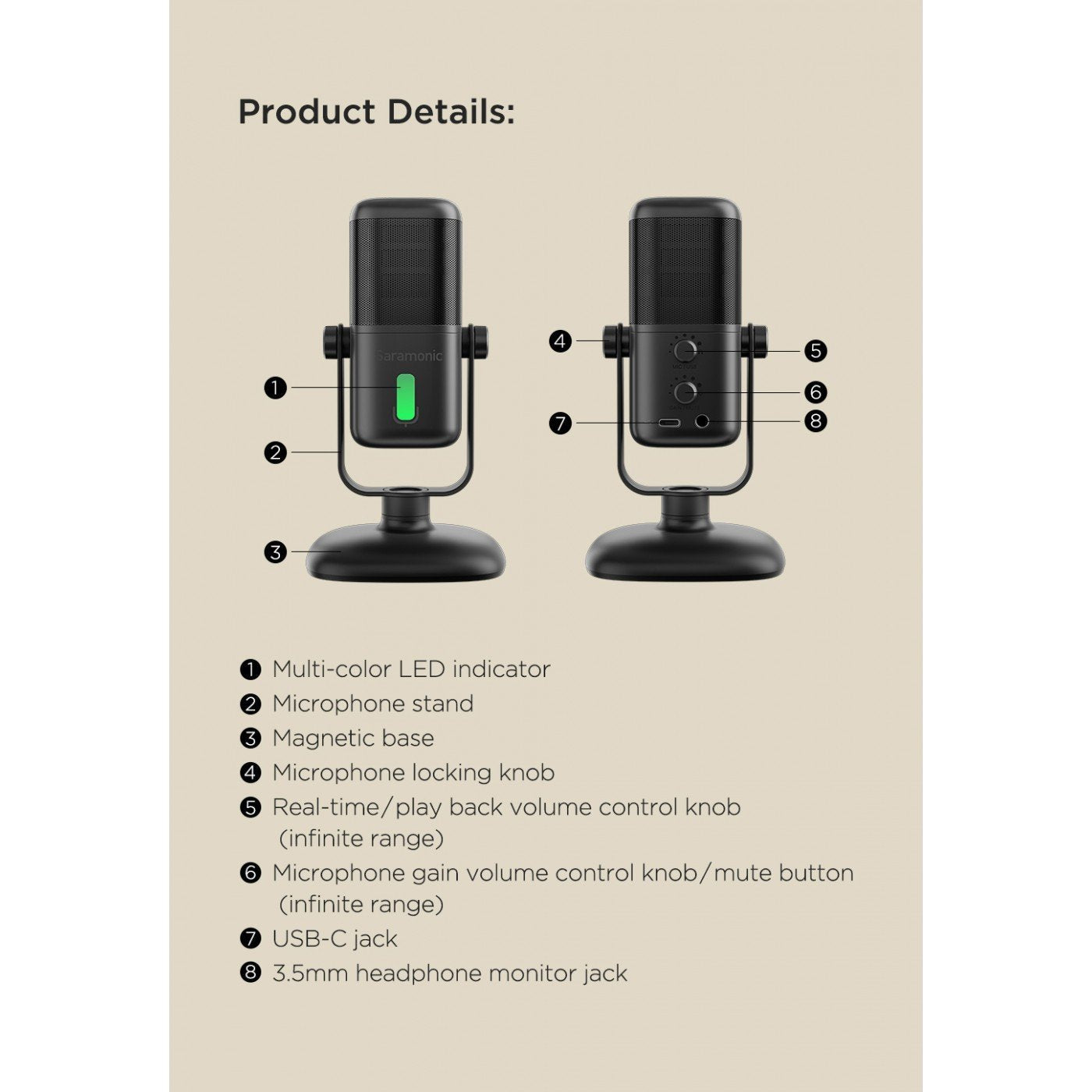 The Saramonic SR-MV2000 USB-connected condenser microphone is a device that was created for podcasting, conferences, interviews, game streams or live broadcasts. It will prove itself wherever you need to be heard loud and clear, while maintaining the highest quality of recorded or transmitted sound. Put your best foot forward in Skype and Zoom meetings and forget about hum, crackle and noise. Make professional broadcasts at home and capture all your new song ideas without wasting time setting up equipment. Quickly and conveniently connect the microphone to your computer, tablet or smartphone with USB or USB-C port. An easy-to-read multicolored LED indicator shows you the operating mode, and you can configure the necessary settings using the ergonomic knobs with built-in buttons. The microphone also features an amplifier so you can connect headphones for real-time recording control. You can easily install it on the included desk stand or screw it to a professional tripod. Thanks to the convenient 360° angle adjustment of the microphone, you can perfectly adjust the device to your needs. The Saramonic SR-MTV500 microphone is all you need to prove yourself as a podcaster and create professional broadcasts on important topics you want to share with the world! Main features of the Saramonic SR-MV2000 condenser microphone with USB connector for podcasting cardioid microphone professional recording quality widely applicable possibility to install on a professional tripod with 5/8" thread multi-coloured LED indicator for mode indication Adjustable 360° microphone angle built-in headphone amplifier real-time monitoring of recordings quick mute button Learn the power of a cardioid microphone The Saramonic SR-MV2000 condenser microphone with USB connector for podcasting guarantees professional recordings that you can quickly and conveniently save to your smartphone, tablet or computer. It is the ideal choice whether you are recording alone, or for interviews or broadcasts with a larger group. This unique cardioid microphone will allow you to record crystal clear sound coming straight to the device, while eliminating unwanted background noise. Convenient operation When using the Saramonic SR-MV2000 microphone, you dont have to reach for a mixer to set the optimal listening volume or adjust the signal gain ("gain") to suit your needs. The housing features ergonomic knobs, with built-in buttons that allow you to conveniently set recording parameters. Thanks to the easy-to-read LED indicator, a glance is all it takes to see which settings the microphone is currently using. Exclusive design If you watch game streams, vlogs, broadcasts made by youtubers or podcasts published on YouTube along with video footage, you have surely more than once drawn attention to designer microphones that fit into the composition of the frame. Professional, good-looking equipment is, in a way, the creators business card! Whether the Saramonic SR-MV2000 condenser microphone appears in your shots on a magnetic stand or telescopic tripod, you can be sure that the matte black and modern design will give them a professional touch. Control recordings in real-time The Saramonic SR-MV2000 microphone features a 3.5mm mini jack socket that will allow you to conveniently connect headphones. Real-time monitoring of recorded speech or vocals will allow you to more easily catch errors, slips, mistakes and unwanted sounds. Give yourself full control over the recorded audio without having to invest in additional equipment. The Saramonic SR-MV2000 microphone and a pair of headphones are enough to catch noises that should not appear in the final recordings! Professional listening with mix Want to produce even more professional broadcasts, podcasts, streams and recording sessions? Take advantage of monitoring in "USB" mode and give yourself a true studio listening experience. With the "Play Back" feature, you can hear your recorded voice along with additional tracks such as music, sound effects, or audio from the game youre streaming. This allows you to hear what the final version of your material will sound like, so you can prepare it even better. Turn your smartphone into a professional studio Included with the Saramonic SR-MV200 condenser microphone is a USB-C / USB-C cable that will allow you to quickly and conveniently connect the device to a smartphone or tablet equipped with the appropriate port. This way, you dont have to worry about computer access when youre doing an interview, podcast or broadcast recording in the field. All you need is a mobile device with a USB-C port and an audio recording app to quickly and conveniently record your conversation, speech or ambient sounds anywhere. Magnetic stand Thanks to the ergonomic design of the stand, the Saramonic SR-MV2000 microphone will always remain in place, ensuring comfortable recording, whether alone or during sessions with invited guests. The 360° angle adjustment allows you to optimally match the device to the conditions in which you are recording. Strong magnets will also ensure its stable and optimal positioning. And if your recordings require you to install the microphone on a tripod, the stand can be detached in a second, without wasting time on unscrewing it. Plug it in and record Out of the box, you just need a few seconds to plug the microphone into your smartphone, tablet or computer and start recording. With this simple plug-and-play solution, you dont need the help of professionals to ensure crystal-clear audio quality while videoconferencing, recording podcasts, making your own broadcasts or streaming online games. Convenient tripod mounting The space youre recording in requires the use of telescoping tripods, making it easy to position your microphones for optimal performance? Or are you looking for a way to expand the capabilities of your home studio? The Saramonic SR-MV2000 microphone comes with a special adapter that will allow you to professionally mount the de