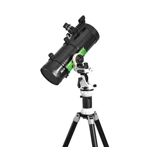Telescopio riflettore Newton con diametro da 114mm, lunghezza focale di 500mm con specchio primario parabolico e con una potenza ottica 360 volte maggiore dell’occhio umano su montatura altazimutale – equatoriale AVANT e treppiede in alluminio regolabile in altezza e a mezza colonna. Oculari diametro da 31,8mm Super 25mm e Super 10mm con cercatore Reddot.