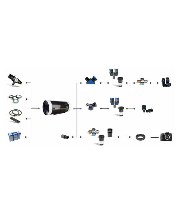 | Oculari ed accessori: | Oculari 25mm (60X) e 10mm (150x) da 31,8mm, diagonale a specchio 31,8mm, attacco a treppiede fotografico e coda di rondine 45mm |