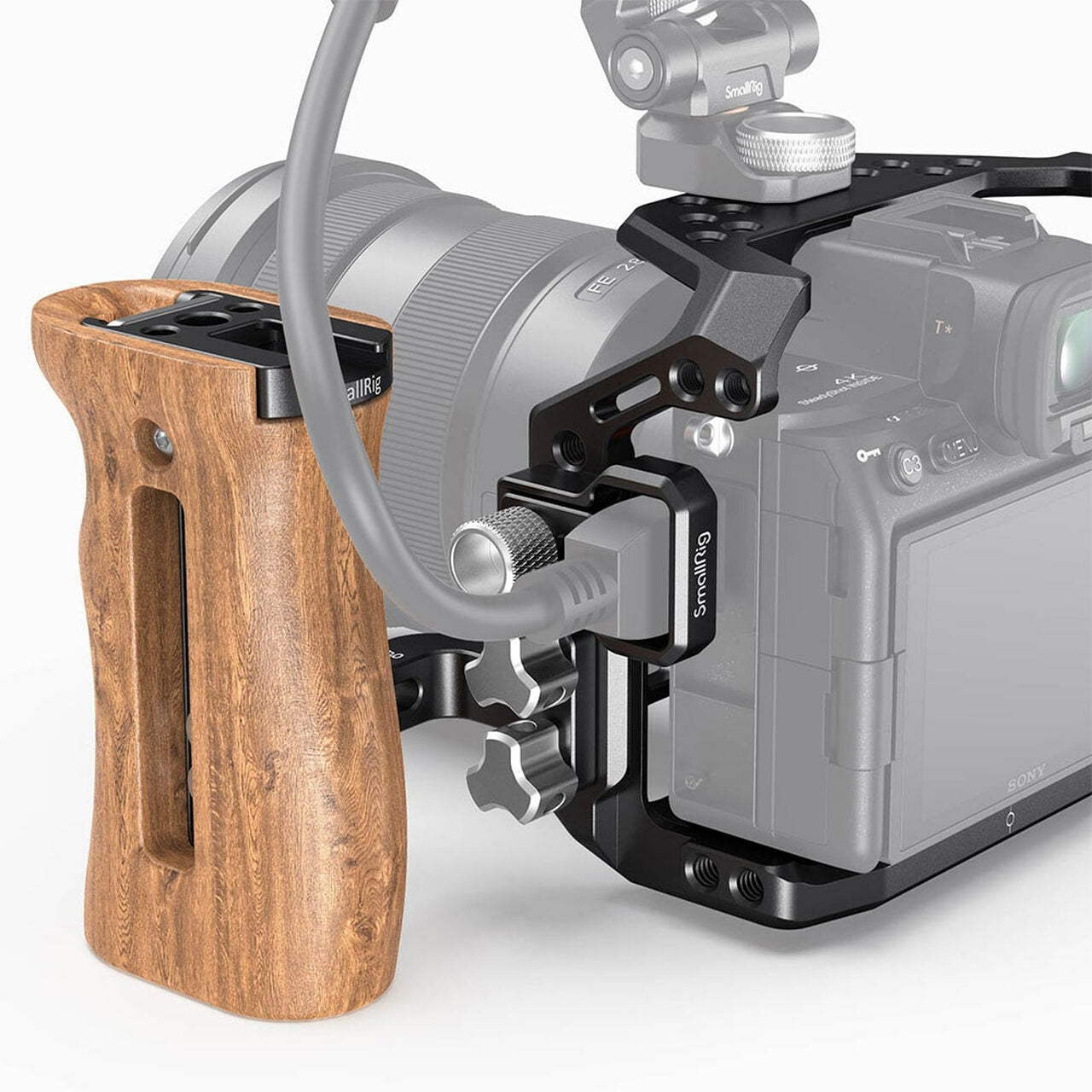Il kit professionale SmallRig per Sony Alpha 7S III A7S III A7S3 3008 include una gabbia completa in alluminio, un fermacavo HDMI e una maniglia laterale in legno. La gabbia della fotocamera è dotata di numerose filettature di montaggio da 1/4"-20 e 3/8"-16, una guida NATO, un attacco per scarpa fredda e supporti in stile ARRI per gli accessori. Il morsetto HDMI si collega al lato della gabbia utilizzando una vite da 1/4"-20 e due perni anti-torsione, che impediscono al cavo HDMI della fotocamera di scollegarsi accidentalmente. Il manico in legno liscio può essere utilizzato a sinistra o a destra per fornire una presa solida e confortevole.