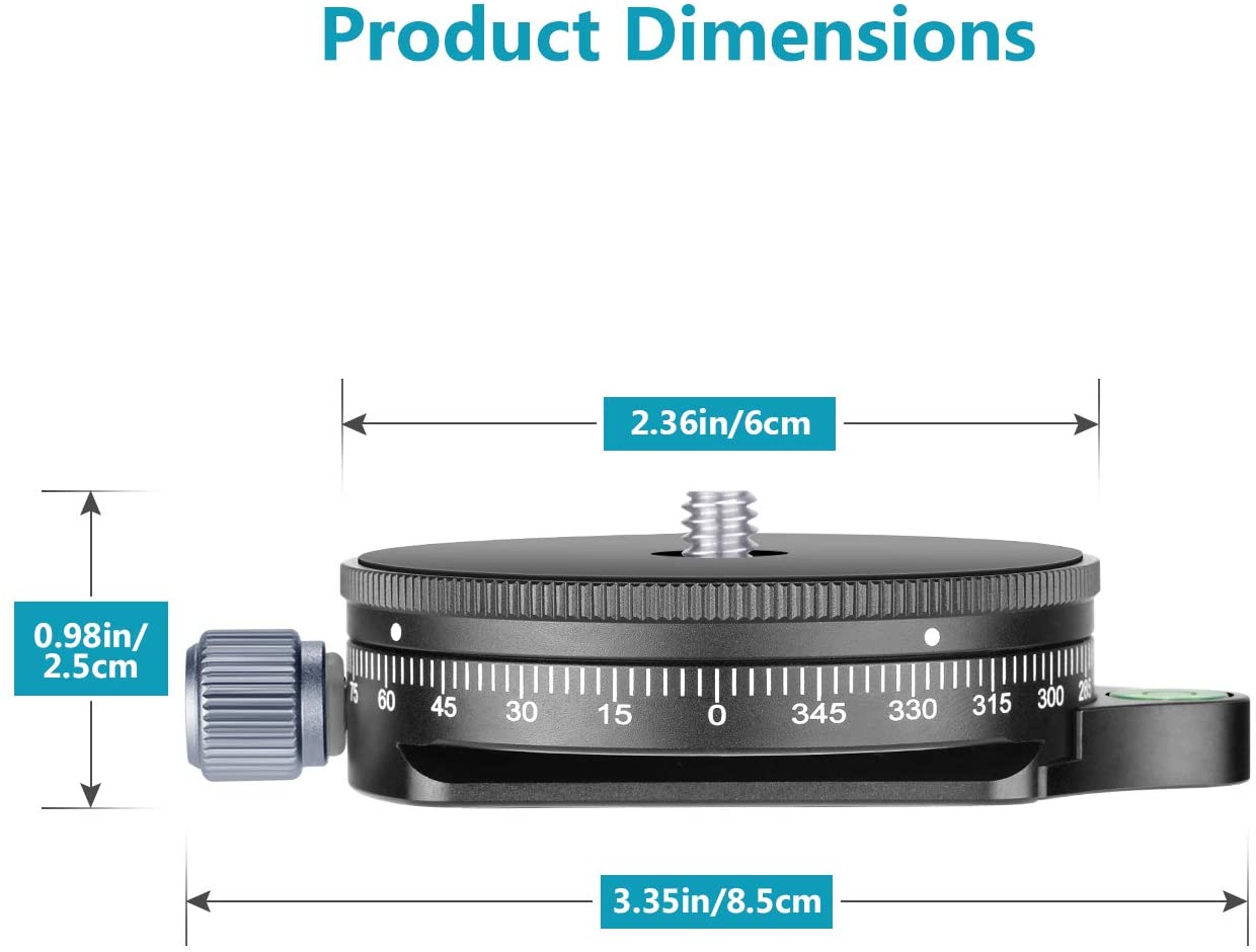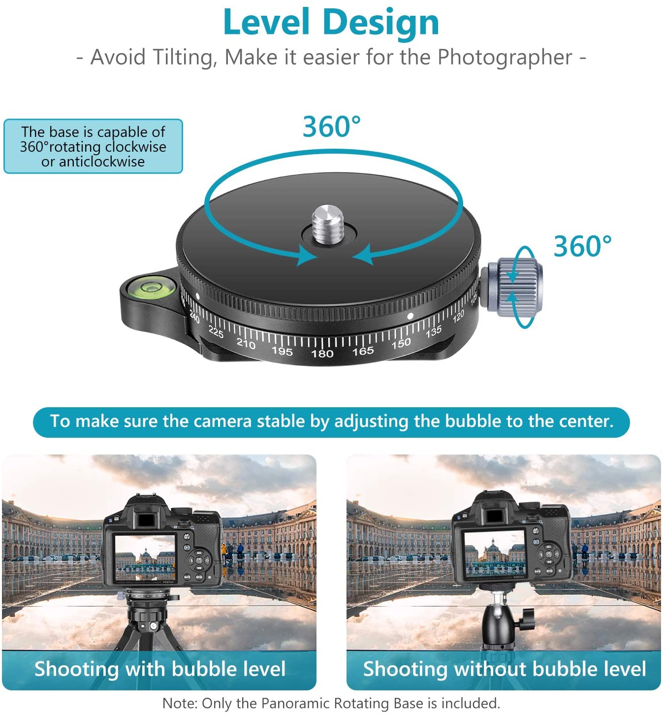Una caratteristica particolare di questa base è la livella a bolla incorporata per l’allineamento orizzontale preciso. Via la manopola conveniente, la fotocamera può essere fissata in qualsiasi posizione desiderata.