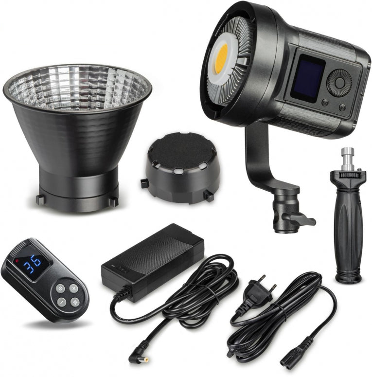 Grazie alle sue dimensioni compatte di 14,2 x 12,1 x 12,1 cm e al suo peso ridotto di 983 grammi, la lampada è facile da trasportare, facile da riporre e occupa pochissimo spazio anche quando è in uso. Con il suo attacco standard a perno, la staffa a U si adatta praticamente a qualsiasi supporto per lampada standard. La maniglia in dotazione consente di tenere la lampada in mano. Tutti i valori impostati possono essere letti sul display LCD chiaro. Questo lo rende ideale per l'uso nelle applicazioni Run'n'Gun, sebbene faccia anche una bella figura in studio per le persone, i prodotti e le riprese di cibo. L'assenza di sfarfallio garantisce buoni risultati anche con progetti video di ogni tipo