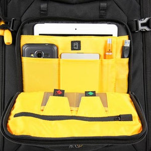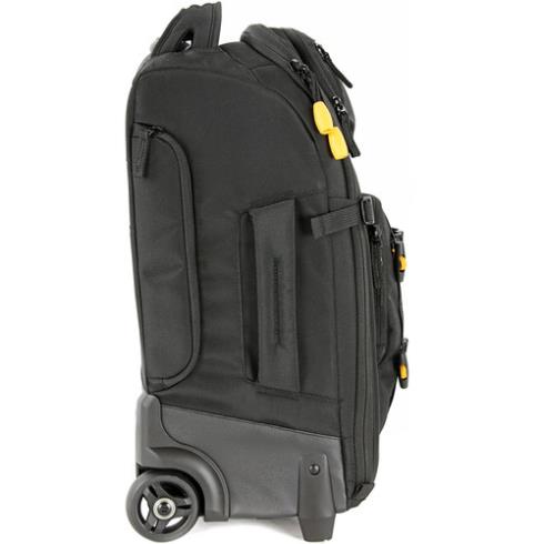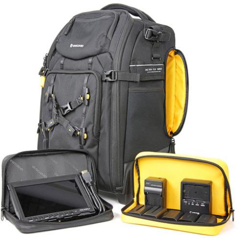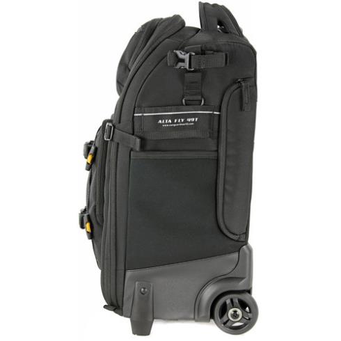Il trolley Vanguard Alta Fly 49T può essere utilizzato nella maggior parte dei casi come bagaglio a mano in aeroplano. Molto mobile, ospita due obiettivi professionali DSLR's, 5-7 ottiche da 300mm f/4, 2 unità flash, diversi accessori e un laptop da 14 pollici. Si può attaccare un treppiede all'esterno.