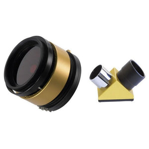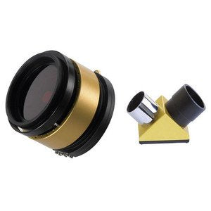 Questo set si compone di un Etalon H-alfa con semi-ampiezza a metà altezza inferiore a 0,7 Ångström e di un filtro di blocco integrato in un diagonale a prisma.