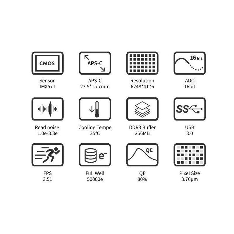 - Sensore Sony IMX571 APS-C a colori da 26 MP (6248×4176), pixel 3,76 µm, BSI