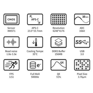 Sensore | Sony IMX571 APS-C monocromatico, 26 MP (6248×4176), 3,76 µm, BSI, ADC 16-bit |