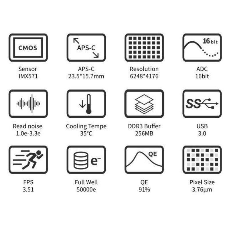 - Sensore monocromatico Sony IMX571 APS-C da 26 MP (6248×4176, 3,76 µm, BSI)