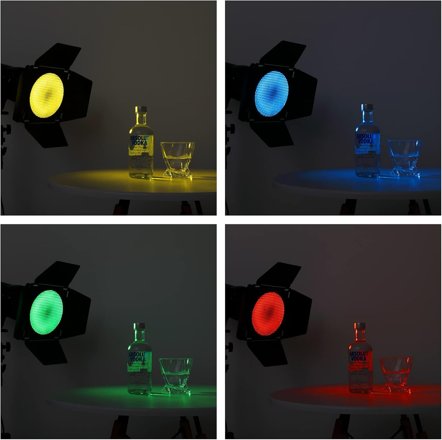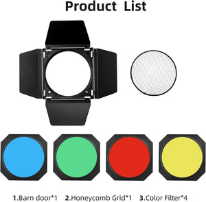 4 filtri colorati consentono di creare diversi colori di sfondo. Si usano per correggere il bilanciamento della luce o per creare effetti di luce drammatici. Sono progettati per essere utilizzati con l'attacco Barndoor, è presente anche una struttura a nido d'ape per il massimo controllo della direzione della luce. La griglia a nido d'ape trasforma una testa stroboscopica in una fonte di luce direzionata. Fornisce un fascio di luce esattamente dove si desidera.