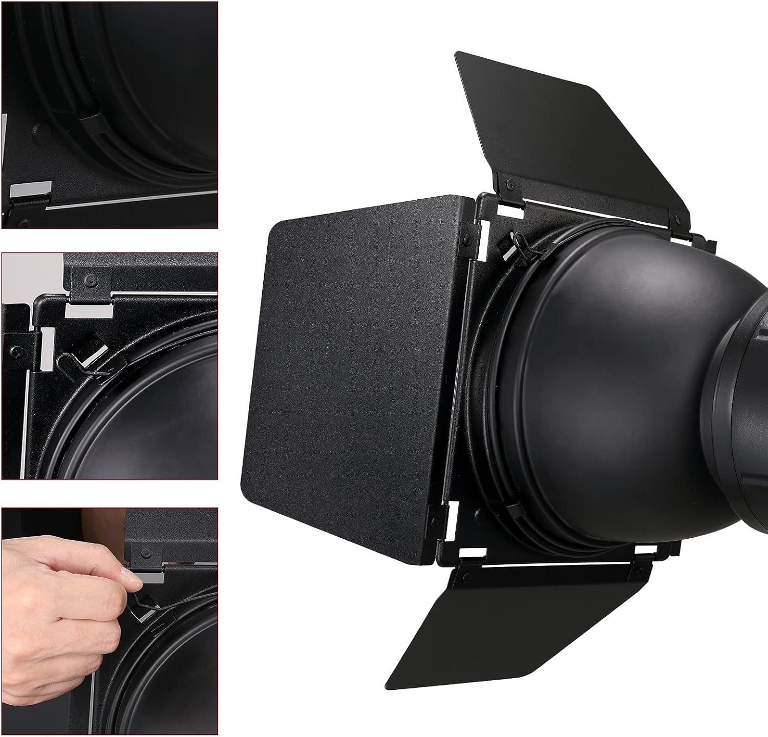 Il set di accessori BD-04 Barndoor di Godox comprende 1 barndoor con 4 ante regolabili montate su un riflettore standard da 17,8 cm per regolare la direzione e la forma dell'illuminazione. Il barndoor è un accessorio essenziale per qualsiasi sistema di illuminazione.