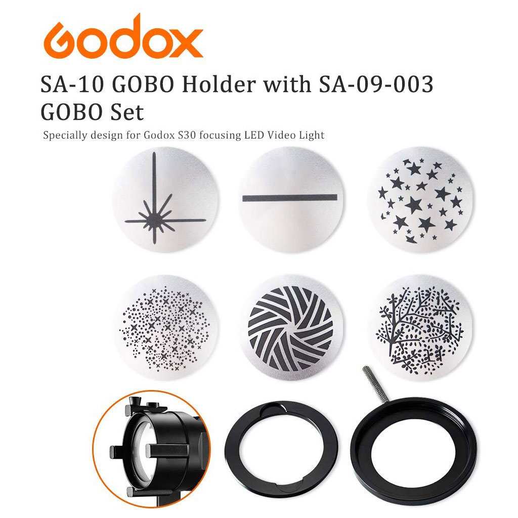 La linea di accessori Godox SA-09, in tutte le sue varianti, presenta un set da 6pz, con ciascuno una forma diversa. Questi accessori sono compatibili con il faro Godox S30 e possono essere montati su di esso tramite il supporto SA-10 (acquistabile separatamente). I patterns sono realizzati in metallo, così da essere rigidi e duraturi nel tempo.
