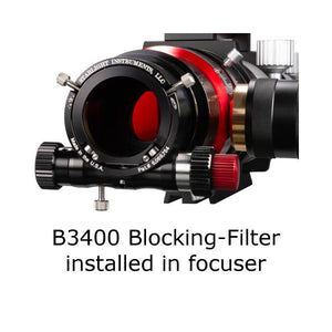 Il filtro di blocco B3400 è molto adatto per la fotografia solare con fotocamere dotate di sensori molto grandi e può essere utilizzato anche per l'osservazione solare visuale. Il filtro di blocco è fissato nel focheggiatore e non nell'ottica di deflessione come in molti altri telescopi solari; anche per questo motivo questo telescopio è ideale per fotografare il Sole.