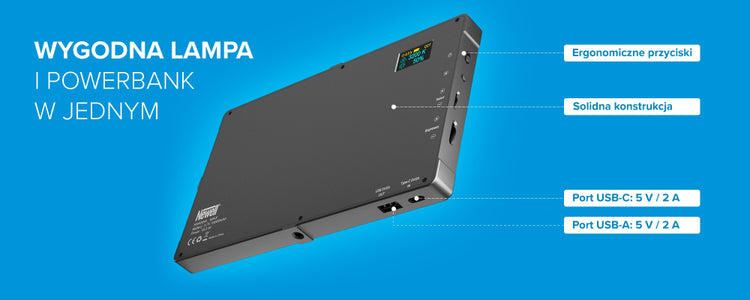La lampada Newell RGB-W Rangha Max LED è dotata di una batteria con una capacità oltre 2 volte superiore rispetto alla sorella maggiore. 10000 mAh ti permetteranno di utilizzare la fonte di luce portatile fino a 3 ore con una sola carica! Sul corpo del dispositivo, oltre alla porta USB-C che permette di ricaricare la potenza della lampada, c'è anche una porta USB. Grazie ad essa puoi trasformare la lampada in un powerbank e caricare facilmente il tuo smartphone, le cuffie o altri accessori che ti accompagnano sul set di ripresa o di fotografia.
