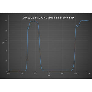 Il filtro UHC Omegon permette il passaggio in particolare delle lunghezze d'onda nell'ambito della luce verde a 496 nm e 401 nm, definite anche righe spettrali dell'OIII.
