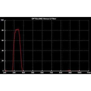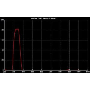 Filtro ultravioletto Venus di Optolong Il filtro U Venus permette di riprendere immagini (CCD, DSLR, Video) nello spettro dell'ultravioletto e quindi di rendere visibili le strutture nuvolose nell'atmosfera di Venere. Molte fotocamere sono sensibili nelle lunghezze d'onda comprese tra 350 e 1100 nm. Il filtro lascia passare la luce tra 320 e 400 nm circa (UV). Tuttavia, nella vostra fotocamera non deve essere presente un filtro di blocco UV/IR, perché altrimenti la luce lasciata passare verrebbe bloccata a priori. Anche alcuni obiettivi di rifrattori bloccano la radiazione UV. Quindi: i telescopi ideali sono i Newton e gli RC. I vantaggi in breve: Permette di fotografare Venere nello spettro UV È dotato di trattamento multistrato antiriflesso Lucidatura ottica di precisione fino a 1/4 lambda su entrambi i lati del substrato Attenzione, questo filtro non deve mai essere usato da solo per l'osservazione del Sole! Attenzione, questo filtro non deve mai essere usato da solo per l'osservazione del Sole!