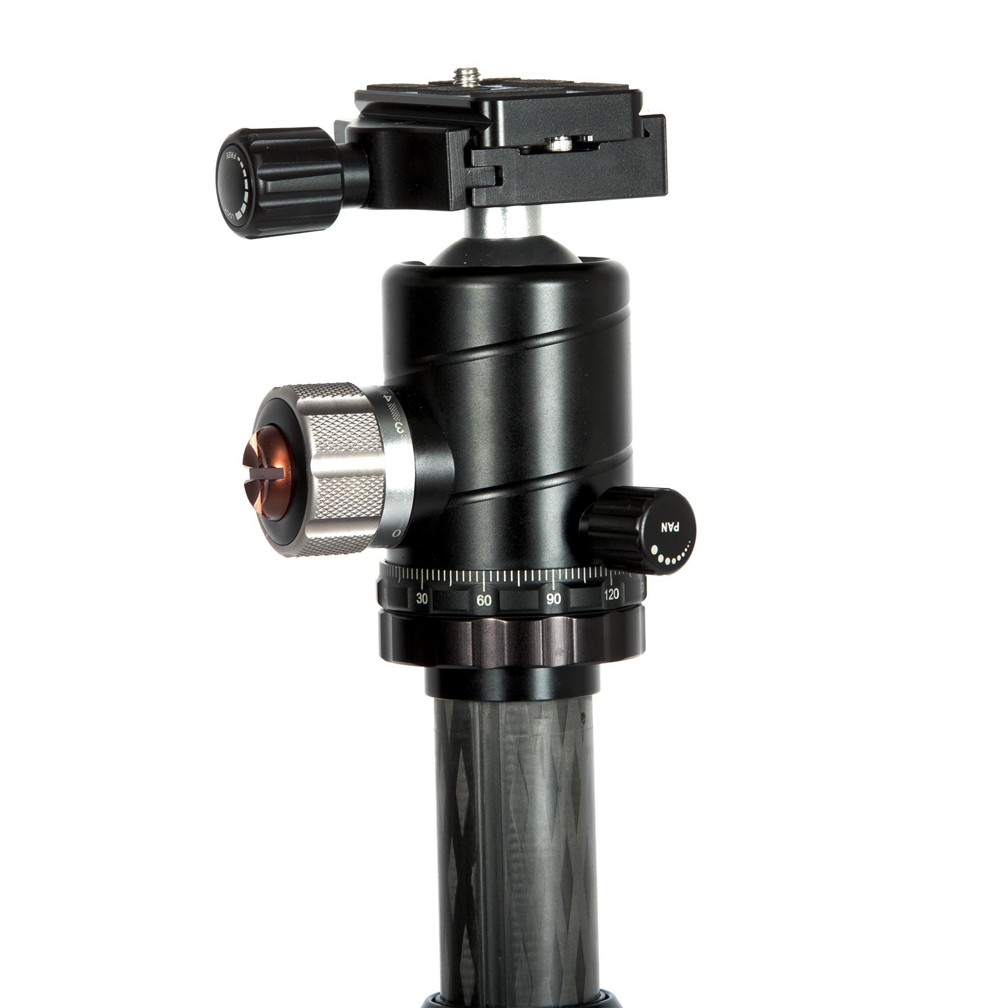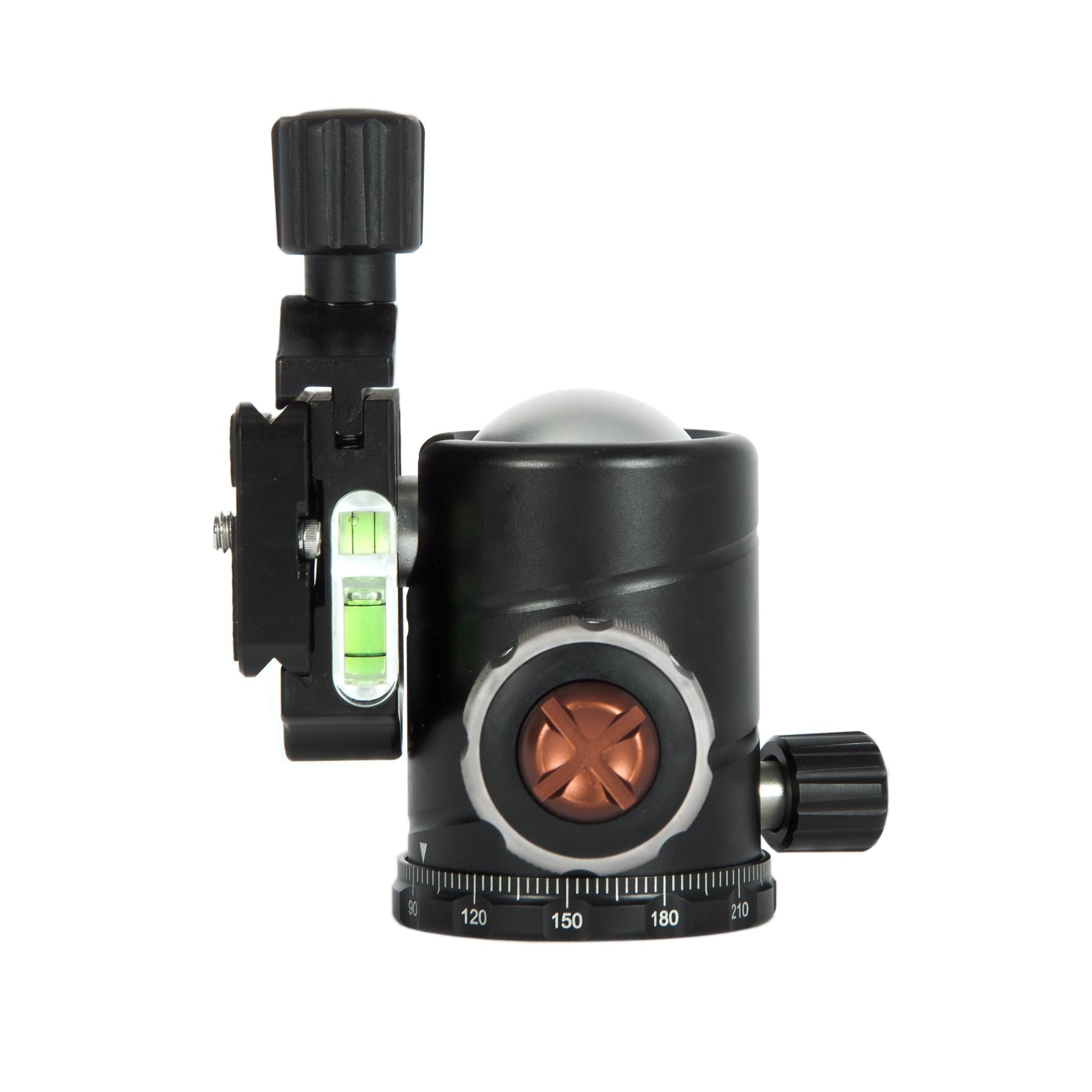 Nella parte superiore della testa si trova la piastra a sgancio rapido, con passo Arca-Swiss standard, e delle livelle a bolla, che permettono di posizionare la testa parallela all'orizzonte. La piastra è dotata di una vite con passo da 1/4", compatibile con le camere e gli accessori fotografici (faretti, supporti speciali, etc..) dotati di tale filettatura femmina; inoltre, la piastra è dotata di speciali gommini, utili ad evitare che il carico si graffi, a contatto con la piastra, o che possa scivolare, se non ben fissato. La base della testa ha una filettatura da 3/8", compatibile con la stragrande maggioranza dei cavalletti, treppiedi e monopiedi fotografici.