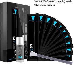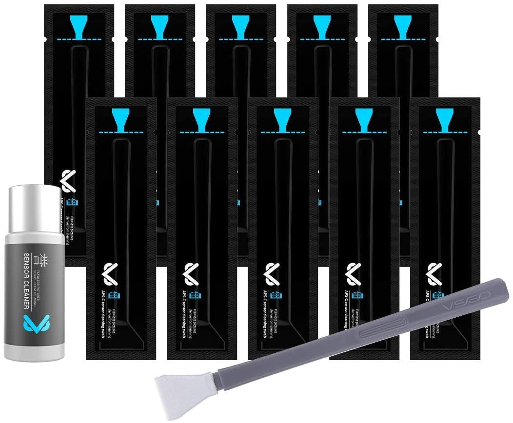 Il kit VS-S02-E per la pulizia del sensore é composto da 10 tamponi e 10 ml di liquido per la pulizia del sensore APS-C.